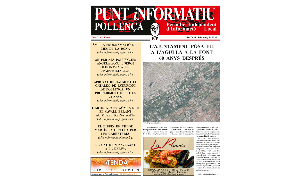 L’edició de la primera quinzena de març del Punt Informatiu Pollença ja és al carrer. El número 729 destaca a la portada un deute que finalment s’afronta: l’Ajuntament posa fil a l’agulla a la Font 60 anys després.