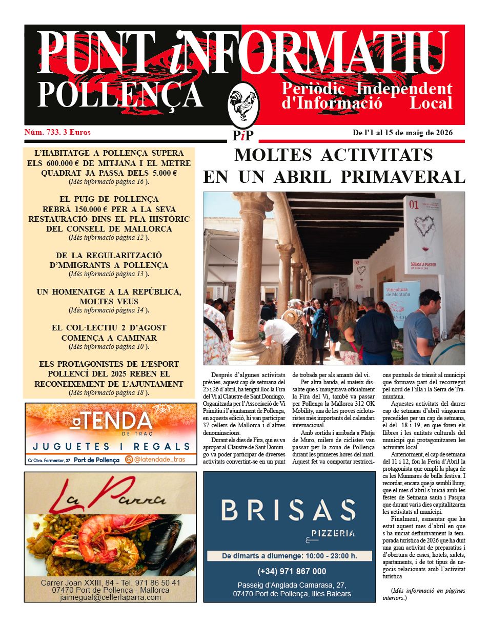 La darrera edició del Punt Informatiu Pollença (Núm. 733), corresponent a la primera quinzena de maig de 2026, repassa un mes d’abril marcat per una agenda social intensa i dades econòmiques preocupants pel que fa a l’habitatge.