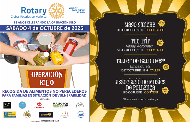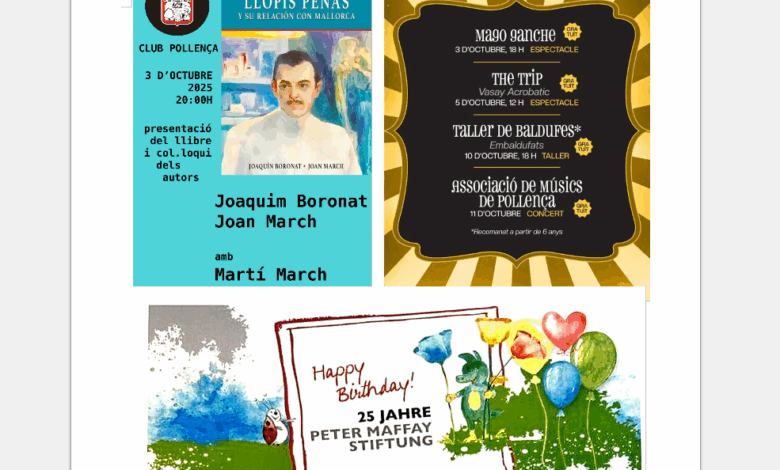 Avui, la Fundació Peter Maffay celebra el 25è aniversari amb una festa oberta a tothom a Can Sureda; es reprenen les activitats a Ca n'Escarrinxo amb motiu dels 20 anys del Circ Bover i es presenta el llibre sobre el metge Llopis al Club Pollença.