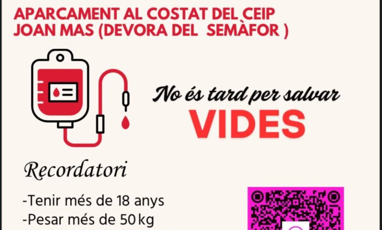 Fins a les 13'30 hores, d'avui, dilluns 26 de maig, a l'aparcament del CEIP Joan Mas, hi ha un bus del Banc de Sang i Teixits per facilitar la donació de sang.