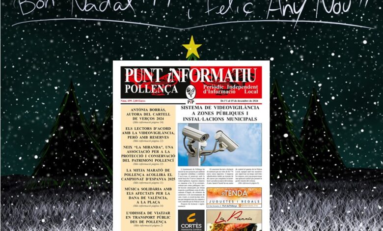 Al Punt informatiu Pollença número 699, corresponent a la primera quinzena de desembre de 2024, es destaca en portada el "Sistema de videovigilància a zones públiques i instal·lcions municipals", però també que Antònia Borràs ha il·lustrat el cartell del recorregut poètic verÇos, que neix l'associació "La Miranda" per vetlar per a la protecció i conservació del patrimoni pollencí, que hi…