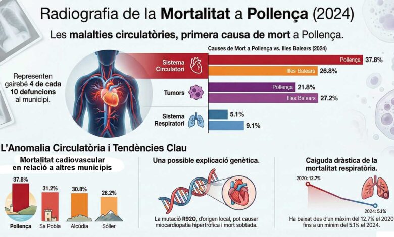 De que morim els pollencins? L'anàlisi de les dades confirma la prevalença de les malalties circulatòries a Pollença, per sobre de la mitjana de les Illes Balears, i una tendència a l'alça en el nombre total de defuncions fruit de l'envelliment demogràfic.