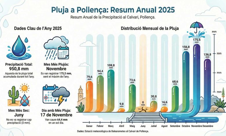 L’any 2025 a Pollença ha estat marcat per una pluviometria molt irregular, amb mesos extremadament secs i episodis de pluja intensa, segons les dades de Balearsmeteo i l’AEMET que repassam a aquest article.